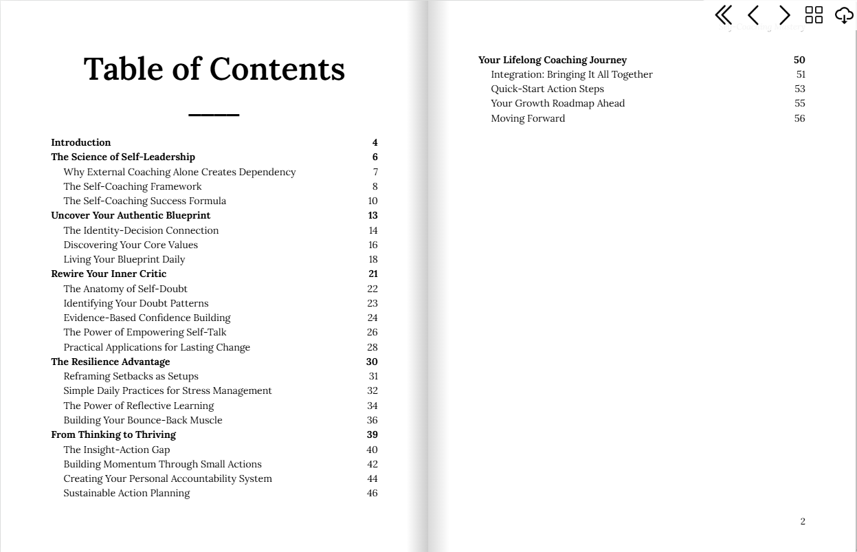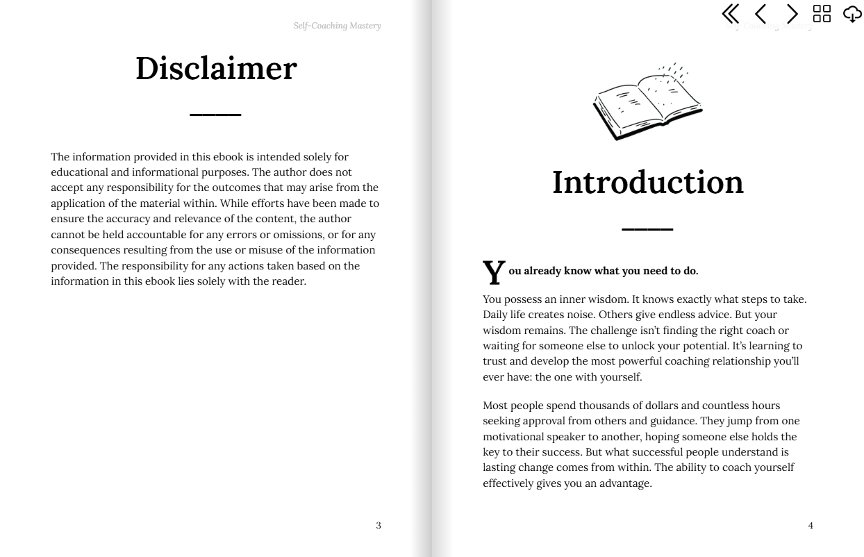 This ebook teaches your customers how to take control of their own mindset, emotions, and goals through self-coaching. It offers clear steps to help people understand themselves better, build new habits, and create positive change without needing a personal coach or therapist.